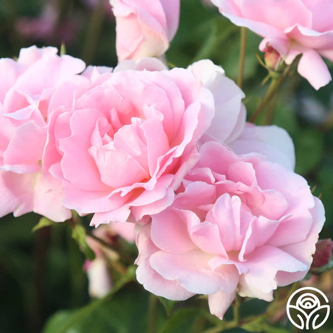 A shrub rose with pointed buds that open into lovely soft pink, double blooms that are at times blushed with soft apricot and white at the base of the petals. The flowers are profusely borne in clusters of 5-10 and are sweetly scented. Large dark green leathery foliage provides a perfect backdrop for the bloom. An upright bushy plant, this friend is winter hardy in the midwest without protection.