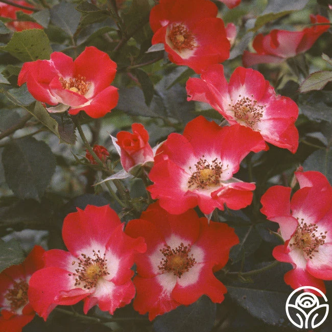 Cherry Meidiland produces 2”, small, red flowers with a white center averaging 4-8 petals each. Her blossoms are borne in small clusters and are prolifically produced on this continual bloomer. Expect her to top out around 5-6’ tall. While she, unfortunately, has no scent, she more than makes up for it with her profuse blooms throughout the season.