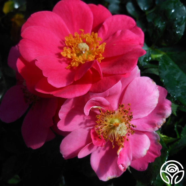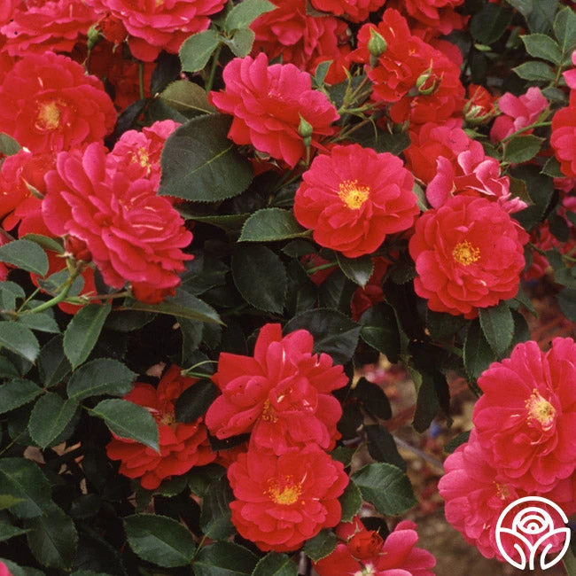 Crimson Floorshow pushes out an abundance of bright, crimson-red, double, 2 ½” blooms that open to reveal rich, golden centers. Crimson Floorshow is a continual blooming, mounding, and spreading plant with rich, leathery, dark-green foliage. She makes a great display in the garden with contrasting colors.