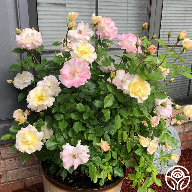 A beautiful color combo in one rose, Easter Basket, displays a simple elegance. Her creamy, light yellow petals have a hint of pink to lavender edging with a ruffled bloom form that cover the plant in abundance. The compact size of this Floribunda makes it especially well-suited to be a low hedge or as a focal point in the garden.