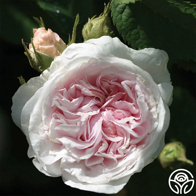 Exceedingly fragrant, beautiful, fully double blooms of a soft pink fading to white, on a compact, bushy once blooming plant with grey-green foliage.