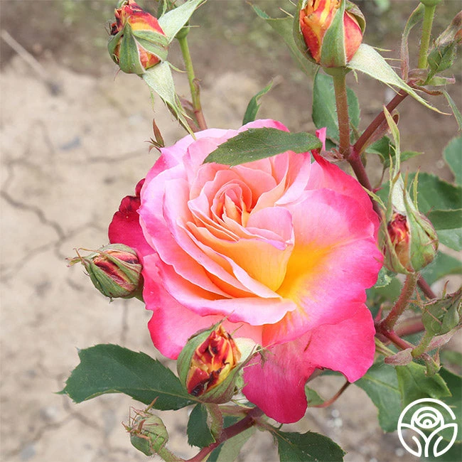 The most fragrant of the multi-colored roses, Granada produces urn-shaped buds which open into classic, large, very double blooms of about 4-5”. The treat of Granada is that the color varies greatly by temperature and zone. In a temperate zone the color is a combination of rose-pink and lemon-yellow blended with red, gold, peach, and apricot. Continual blooming, Granada exudes a strong, spiced scent, and makes an excellent cut flower.