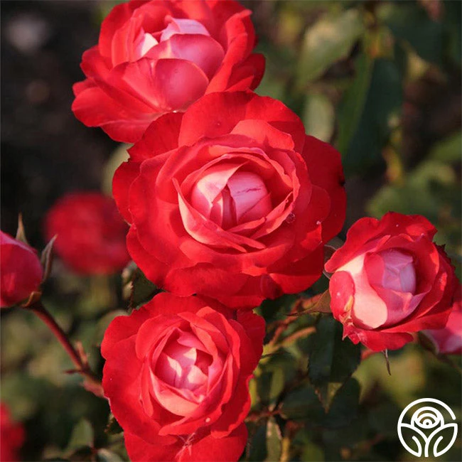 This extremely healthy and compact Floribunda has beautiful and unique coloring with brilliant orange-red petals and a cream reverse. Mandarin Ice is a vigorous grower and her semi-double to double clusters of flowers are a favorite of pollinators. She is a gold medal winner in international competition.