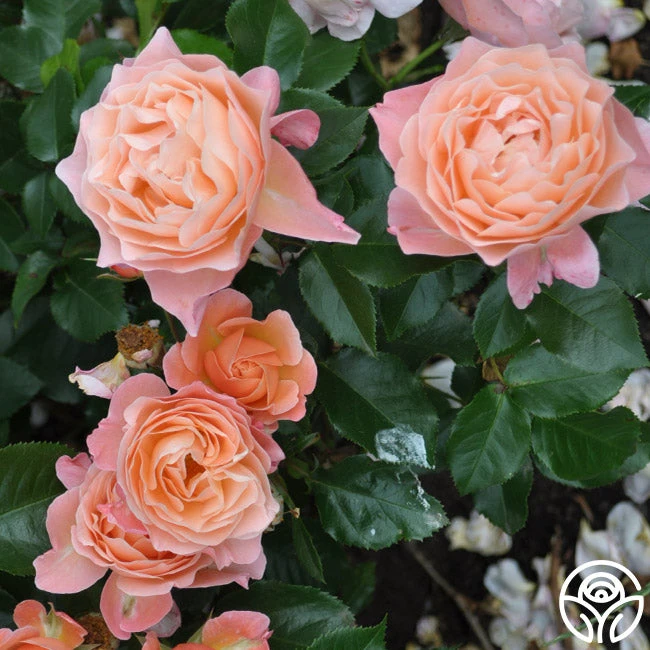 Marie Curie pushes out abundant clusters of ruffled, shrimp pink and gold blooms set against deep green, glossy foliage. She has a moderate, delicious clove fragrance wafting from her desert tone blossoms. Blooms will cover this vigorous, compact rose all the way to the ground. We love Marie Curie as a low hedge.