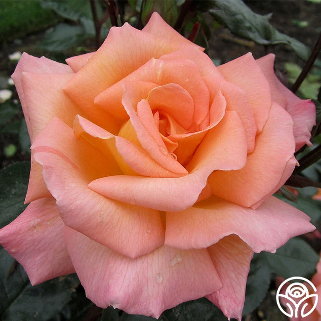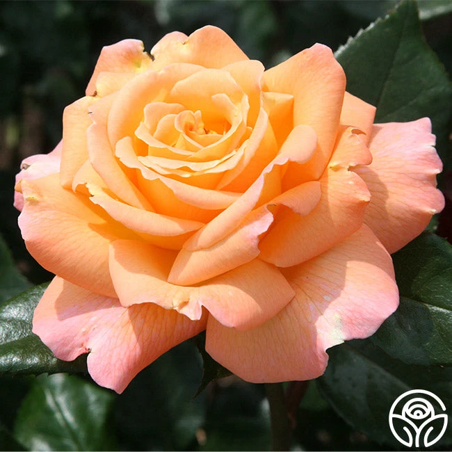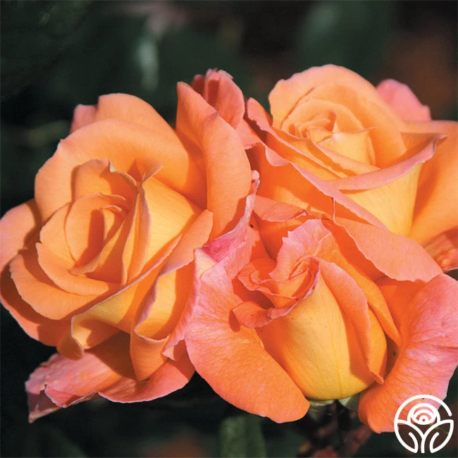 With fully double 4-5” blooms of 35+ petals 35, Rosemary Harkness is a stunning continual blooming rose. Her petals are draped in an orange-salmon color with a contrasting orange and yellow reverse set against dark, glossy foliage. Rosemary Harkness is both a Gold Medal and Fragrance Award Winner.