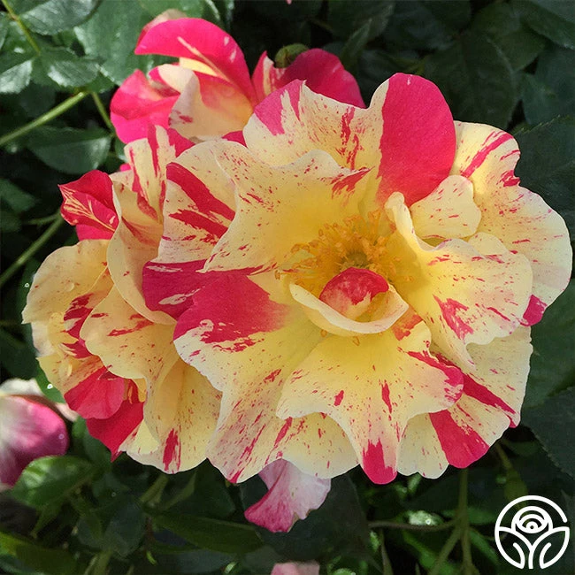 Show some School Spirit with this showy, yellow blended rose with red stripes. Her 3″ flower have 8-10 petals and bloom in clusters. Expect School Spirit to show off in flushes throughout the season on a bushy plant with dark green foliage.