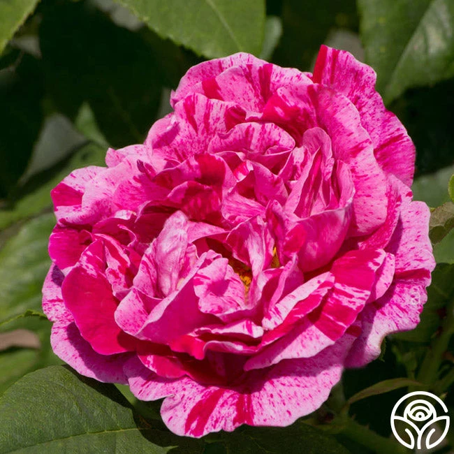 Bred in the mid-1800s, Tricolore de Flandre features double blooms with pink and white striped coloring making this Old Garden Rose truly unique. This plant is a one-time bloomer in the summer but will leave you in awe long past the season. She grows in a small and tidy shrub and is very disease resistant, making her suitable for pots and containers. As an added bonus, Tricolore de Flandre is nearly thornless!