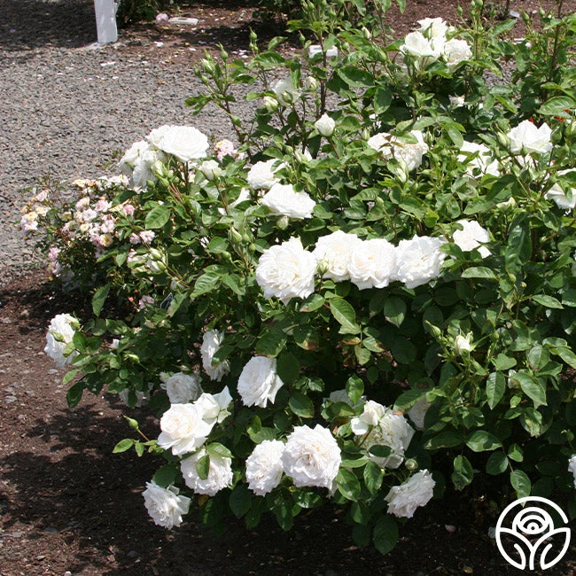 White Floorshow produces fully double, old-fashioned blooms of crystal white that are produced in profusion. Expect her to be a continually blooming and generously spreading plant with mounding growth and mid-green foliage. Great for your landscape or garden areas, she also does well in hard-to-grow places such as parking strips, boulevards, and curbs.