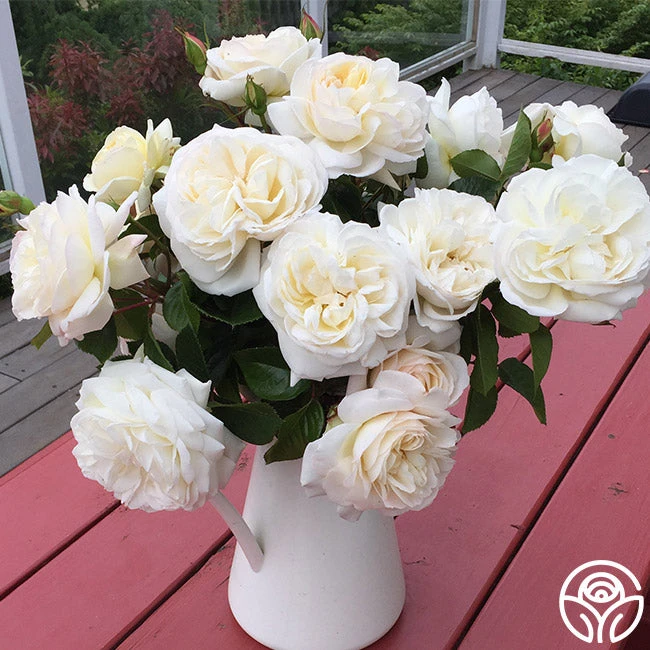 White Gold lives up to her name with true white blooms infused with subtle light amber-pink hues. She is a stunning plant with strong fragrance and shiny green foliage. Give her a couple growing seasons to get established and she will reward you with blossom upon blossom for all of your arrangements. White Gold has won several awards including: Most Fragrant Rose Award and Japan Rose Concours 2003.