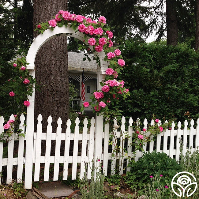 Zéphirine Drouhin is a beautiful and consistent, Climbing Bourbon with large, 4” flowers on nearly thornless canes. Her blooms have 16+ petals and are deep rose-pink, extremely fragrant, and produce lavishly as she blooms in flushes throughout the season. Zéphirine Drouhin is hardy, doesn’t mind partial shade, and will take off if she is given time to establish her roots and space to send out her long canes that can grow upwards of 10-15’. This special Bourbon is a favorite among many of our customers!